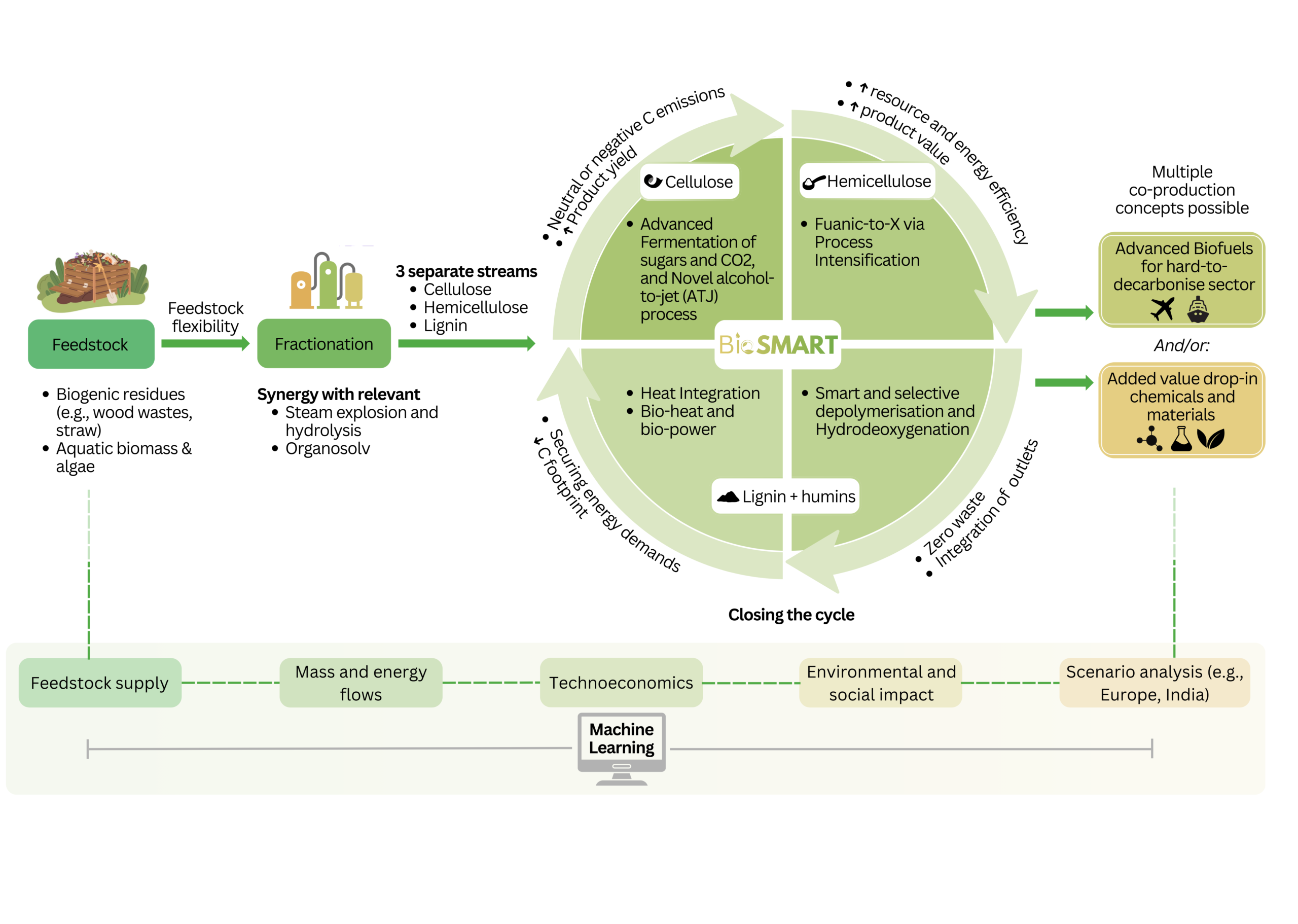 BioSMART is shaping the future of zero-waste biorefineries by transforming lignocellulosic biomass into sustainable fuels, high-value chemicals, and advanced biomaterials. Through an integrated circular approach, the project combines cutting-edge catalytic and biocatalytic technologies with process intensification to maximize resource efficiency, reduce production costs, and accelerate market uptake. By linking European and Indian expertise, BioSMART is building resilient and scalable biomass value chains for a cleaner, more competitive, and low-carbon future.